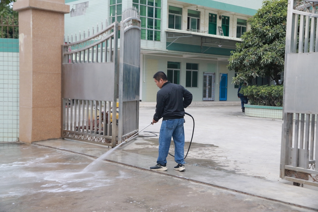 事情职员在门口举行消毒